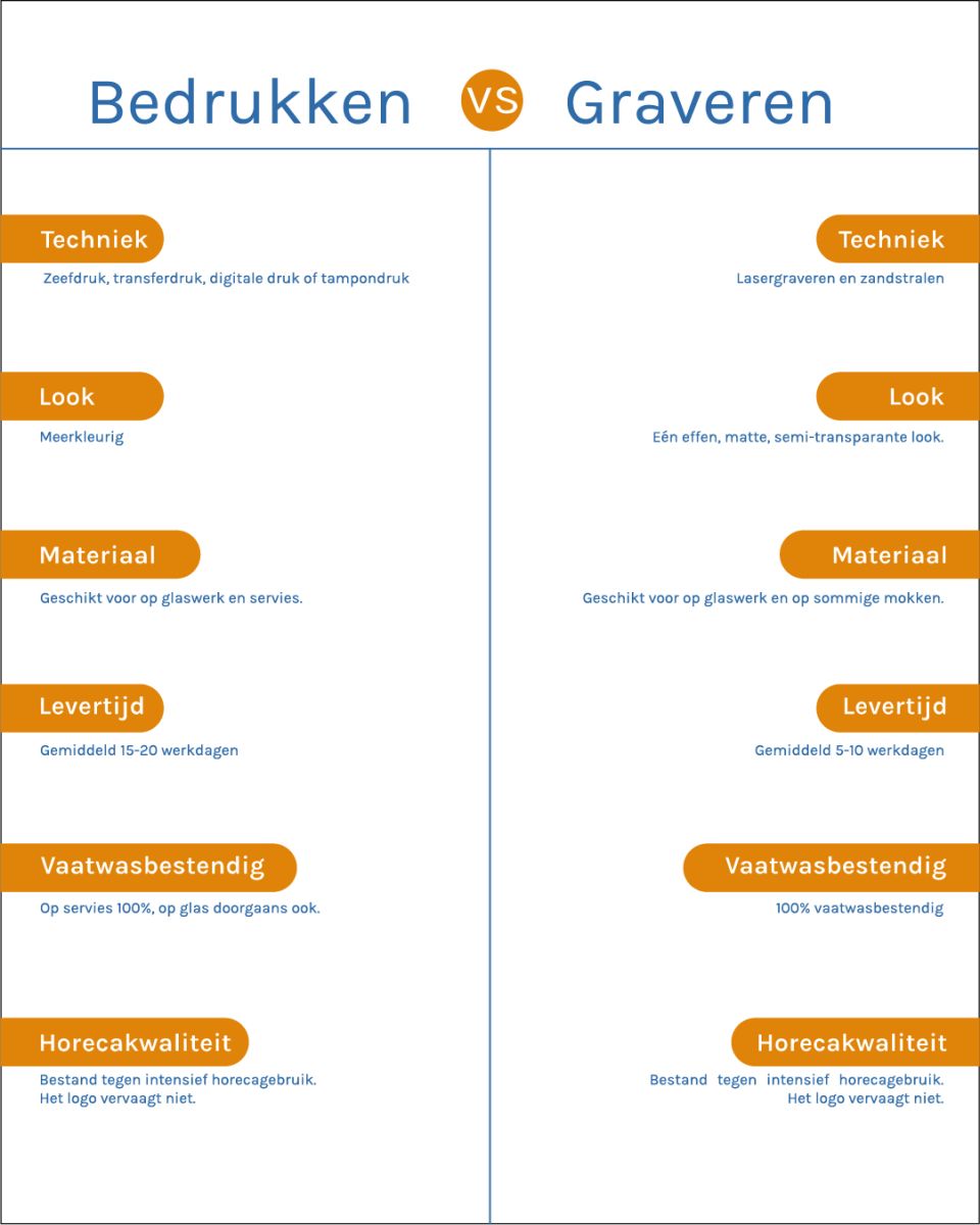 Als horecaonderneming wil je jezelf graag onderscheiden van je concurrentie en jouw naam groot maken of houden. Een effectieve manier om dat te doen, is door je logo op je servies en glaswerk te plaatsen. Zo kan iedereen zien wie jullie als bedrijf zijn! De twee populairste technieken hiervoor zijn bedrukken en graveren. Beide methoden hebben hun kenmerken en effectieve voordelen. Hieronder leggen we je uit hoe deze technieken werken en wat de voor- en nadelen zijn.